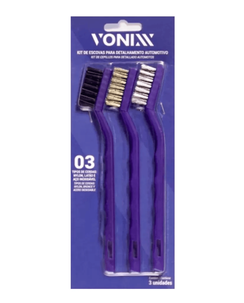 تحتوي المجموعة على ثلاث فرش تفصيلية بأنواع مختلفة من الشعيرات: النايلون والنحاس والفولاذ المقاوم للصدأ. تم تطويره لأغراض متعددة مثل العناية بالسيارات والعناية بالدراجات النارية والتنظيف العام للأجزاء. جميع الفرش الموجودة في المجموعة مصممة هندسيًا وسهلة الاستخدام.